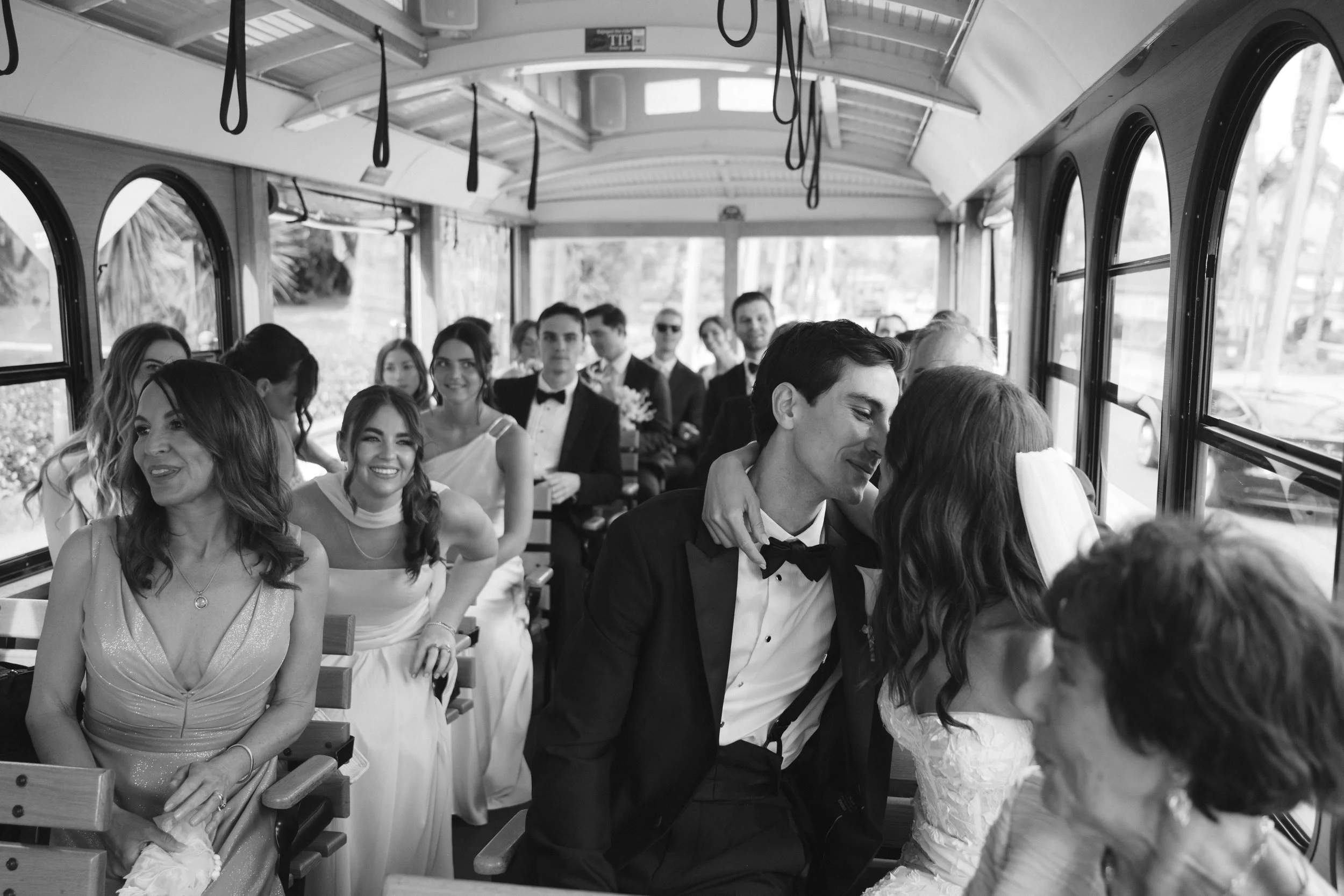 Rather than a car or a limo, Chiara and Michael arrived at their first look the way Santa Barbara locals do things: by vintage trolley. The ride from the Palihouse to the Santa Barbara Courthouse — one of the most breathtaking civic buildings in the country — set a tone of joyful, unhurried celebration that carried through the entire day.